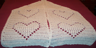 This is a pic of the finished heart shawl pattern I was testing for Sandie. The one that Leisure Arts says that she can't post. UGH! It is a beautiful pattern and easy to work up. There are 6 hearts. 3 going in one direction and 3 going backwards.