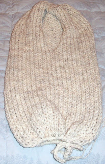 First, before binding off, K2TOG across, next row Purl2TOG across, next row K2TOG there should be 6 stitches left or however many you have. Thread yarn through stitches left on hook and draw closed. The other thing she did was to make a drawstring bottom so as to be able to open it up to change diapers. I thought that was excellent. Not sure I made my drawstring quite long enough but, I think it will be ok. I will get feedback when I send it out whether I will make more of these or not. There are a couple of mistakes in it but, unless you know where they are, you'll never know. lol I can't tell by looking at it. So, I hope it will be ok.